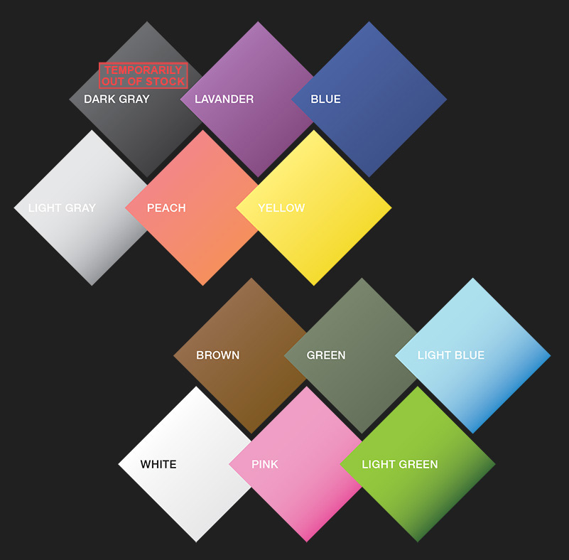 Lavender, Blue, Brown, Green, Light Blue, Light Gray, Peach, Yellow, White, Pink, Light Green